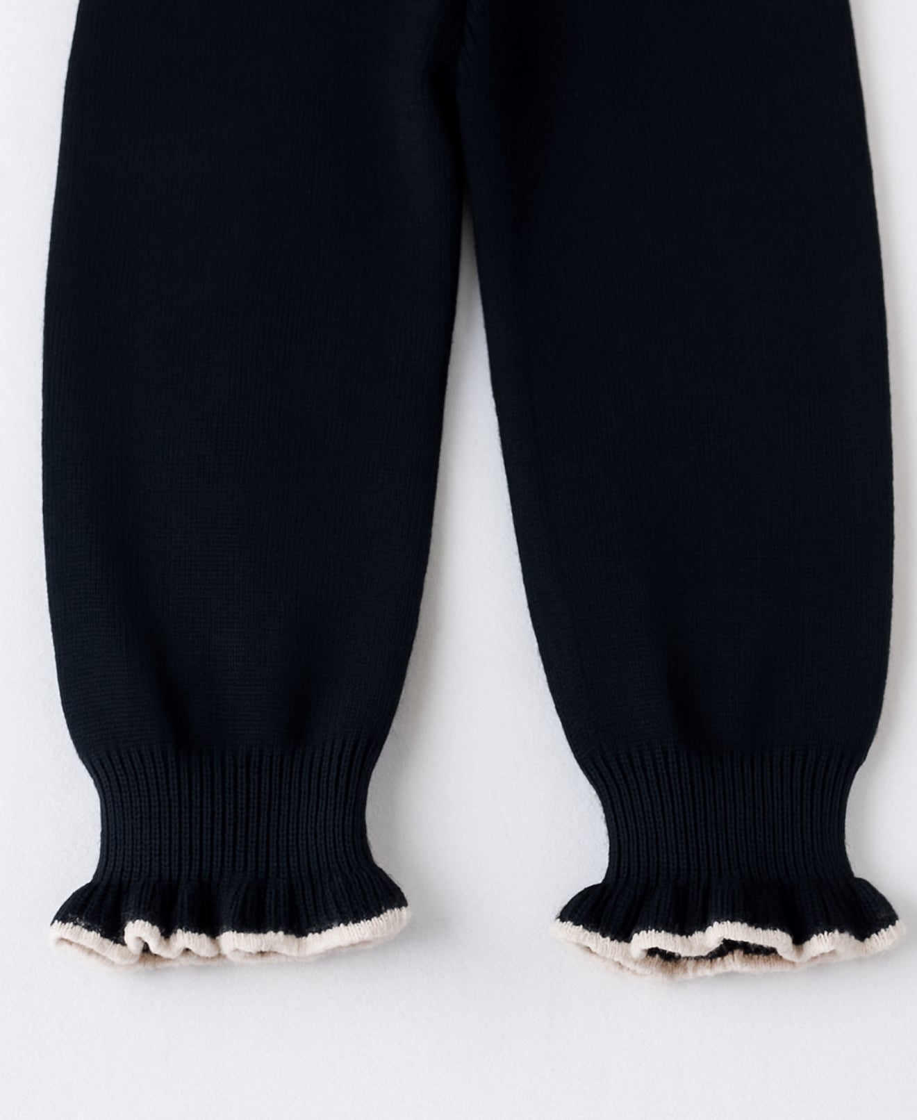 Cozy and cute, this two-piece knit set features a cream cardigan with charming black heart details and matching ruffle-cuff pants.