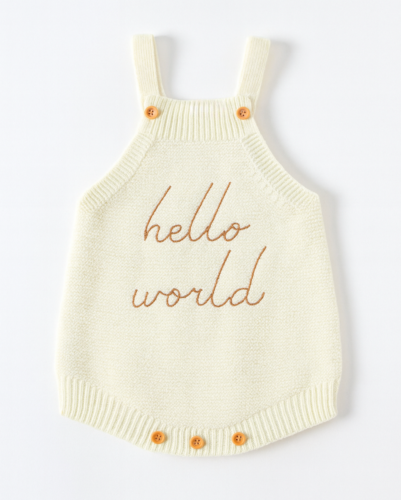 Simple and sweet romper features a buttoned front and delicate embroidered "hello world" detail. Crafted in soft beige tones for a cozy, timeless look — perfect for everyday wear or newborn photos.